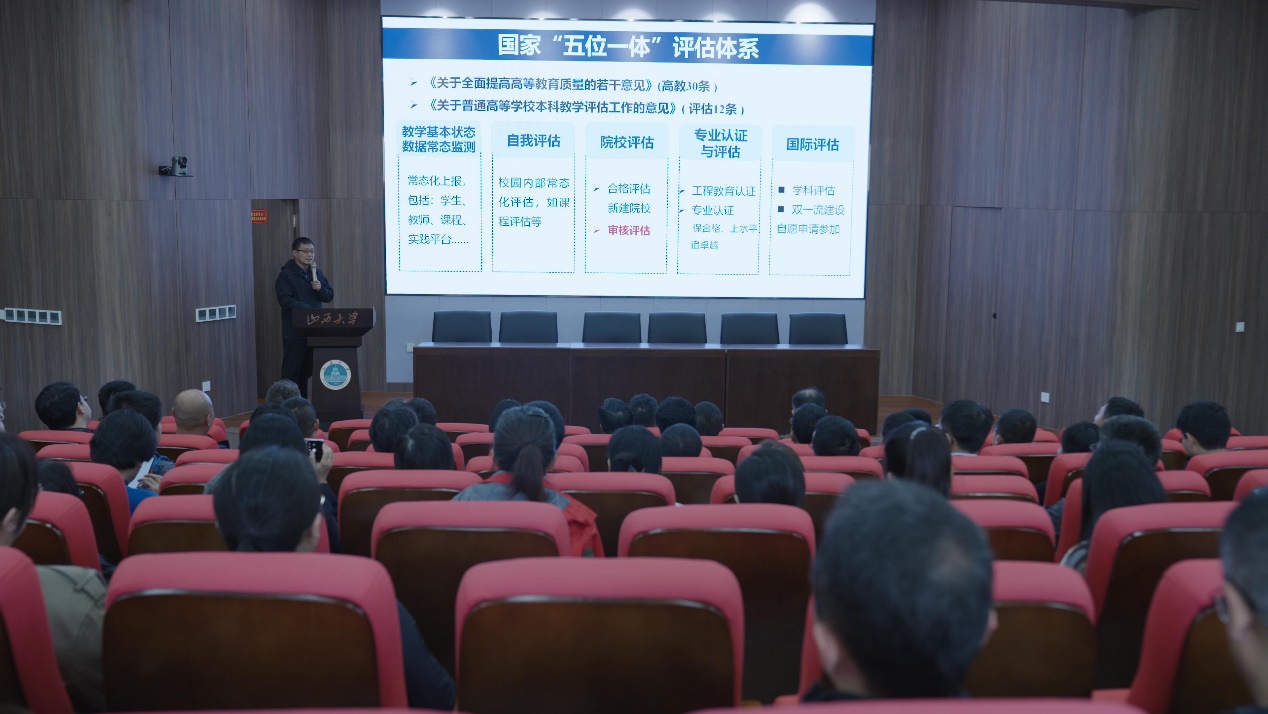 接着,武志涛副院长详尽阐述了本次评估工作的背景。他指出,此次会议不仅是对新一轮审核评估的全面动员,更是积极响应学校本科教育教学改革战略部署的关键举措。评估工作需紧密围绕党的教育方针,坚决落实立德树人这一根本任务,通过细致的自我审视,精准查找本科教育教学中的薄弱环节,并采取切实有效的措施加以改进。同时,他强调要充分利用评估契机,以评促建、以评促改、以评促管、以评促强,全面提升本科教育教学质量,充分彰显学校优良的校风、教风和学风。随后,武院长讲解了新一轮审核评估的重要意义、核心内容及评估流程等关键要素。他特别指出,学院及每位教师在迎评过程中,应紧扣学习文件、积极筹备、认真总结、严把质量、加强管理这五大核心环节,为教育教学评估工作做好充分准备。最后,他就后续评估工作的具体安排进行了周密部署,并强调当前迎评工作已进入至关重要的冲刺阶段,全院上下务必高度重视,针对学校反馈的问题迅速整改,确保各项准备工作高质量完成。